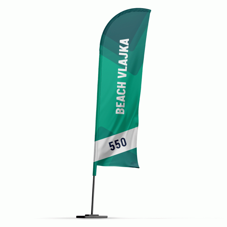 Beach vlajka / reklamní vlajka je ideální mobilní reklama, kteoru můžete použít jak v interiéru tak exteriéru, kde odolová i povětrnostním podmínkám. V tomto případě se jedná o beach vlajku velikosti 550 cm. Upoutejte své zákazníky zajímavým reklamním prvkem, který je jako bonus i lehký, kompaktní a velmi mobilní díky možnosti dokonalého složení. Beach vlajka může být v několika různých tvarech viz ukázka v galerii.